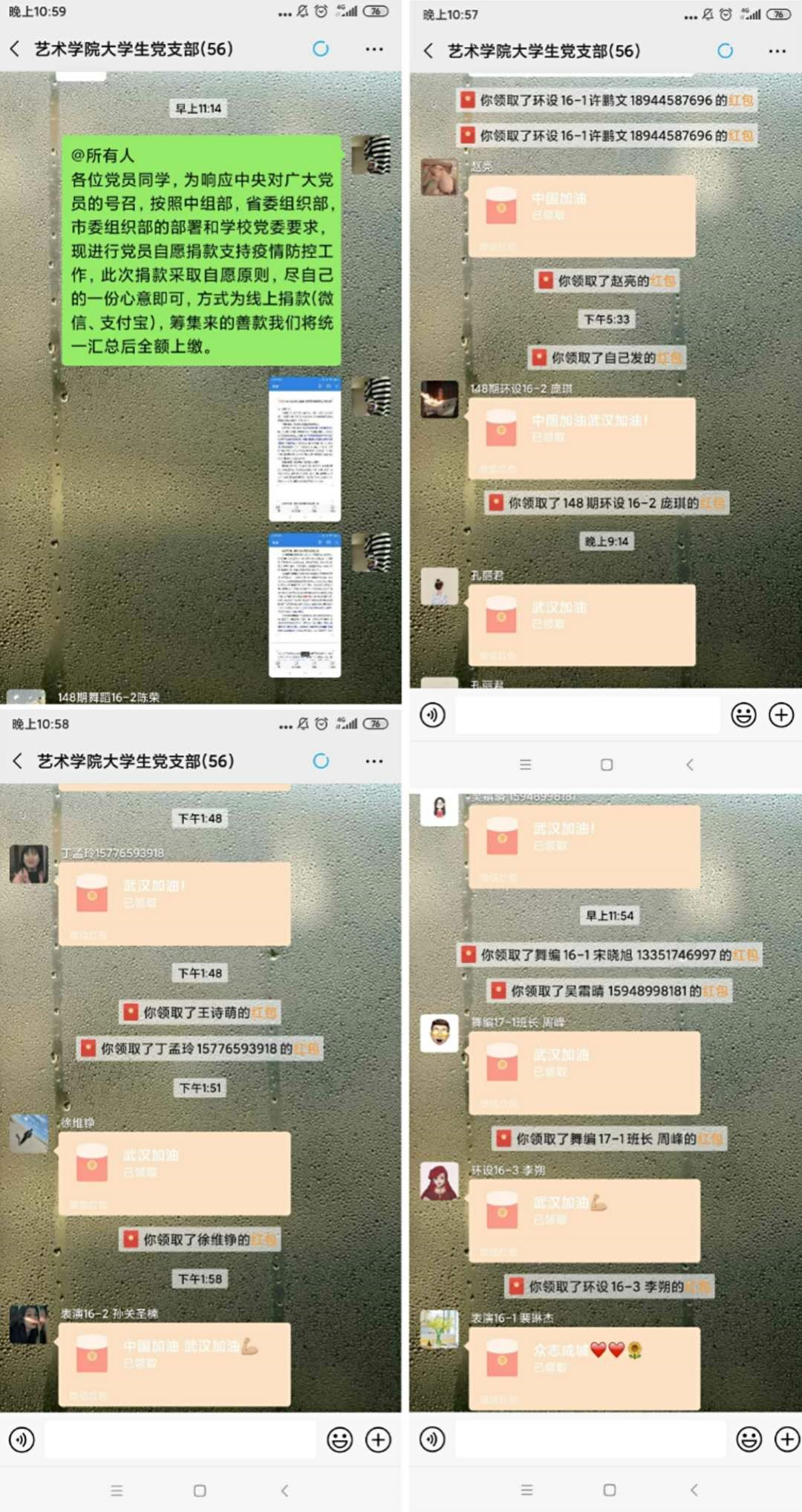 截止28日18时,党支部全体54名学生党员累计捐款3273元。学生党员说,千里送鹅毛,礼轻情意重,也许我们的贡献力量微不足道,但是我们有着一颗颗心系祖国、心系武汉的中国心。