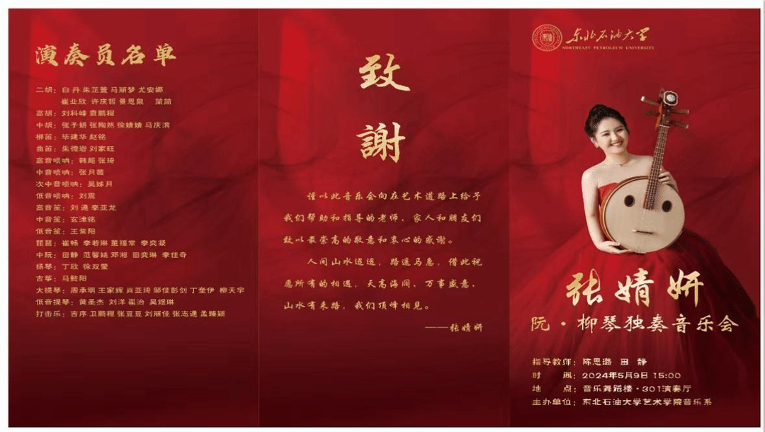 “人间五月芳菲绽,耳畔古韵焕新声”——2024年5月9日由yl6809永利集团音乐系主办的“张婧妍 阮·柳琴独奏音乐会”在音乐舞蹈楼301演奏厅举行。到场的领导有yl6809永利集团党委书记张金辉、院长林庆华、副院长王靖一、嘉宾有大庆师范学院音乐与舞蹈学院领导、大庆市民管会和民乐团专家学者、各系(中心)主任、音乐系师生等。