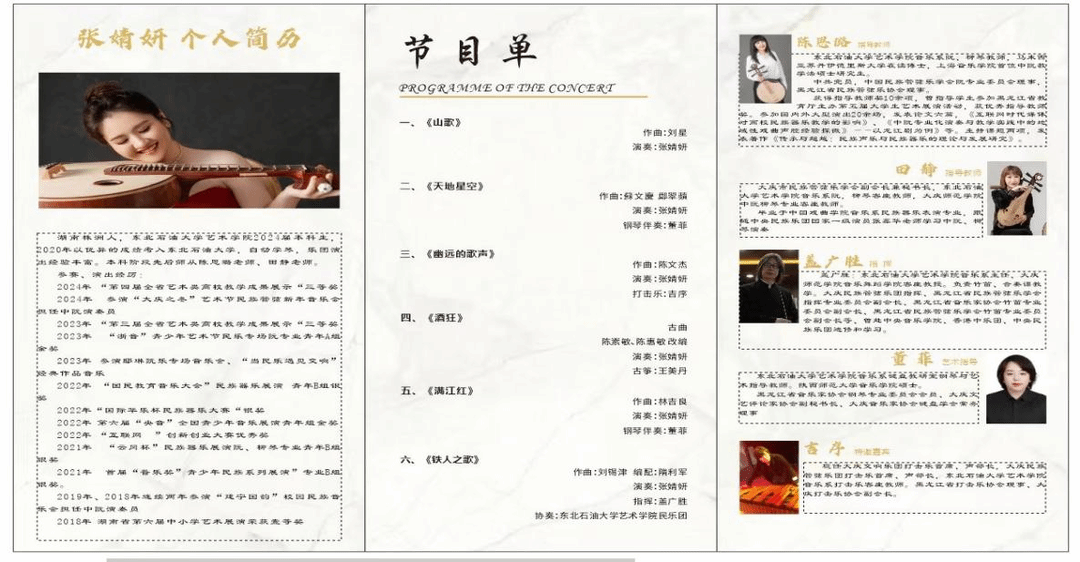 阮独奏《山歌》作为开场曲目,悠长神秘又似有对句的慢板让人仿佛置身山林之中,欢快活泼的快板节奏感十足。柳琴与钢琴《天地星空》旋律优美动听,令人沉醉。阮与打击乐《悠远的歌声》旋律时而柔美细腻,时而热情奔放,具有浓郁的新疆作品风格。阮与古筝《酒狂》意境十足,时而优美,时而热烈。阮与钢琴《满江红》曲调沉厚有力,气势昂扬、通过描写民族英雄岳飞的光辉形象,激发出对祖国的无限热爱。张婧妍本科专业指导教师陈思璐、田静,本场音乐会艺术指导教师董菲。