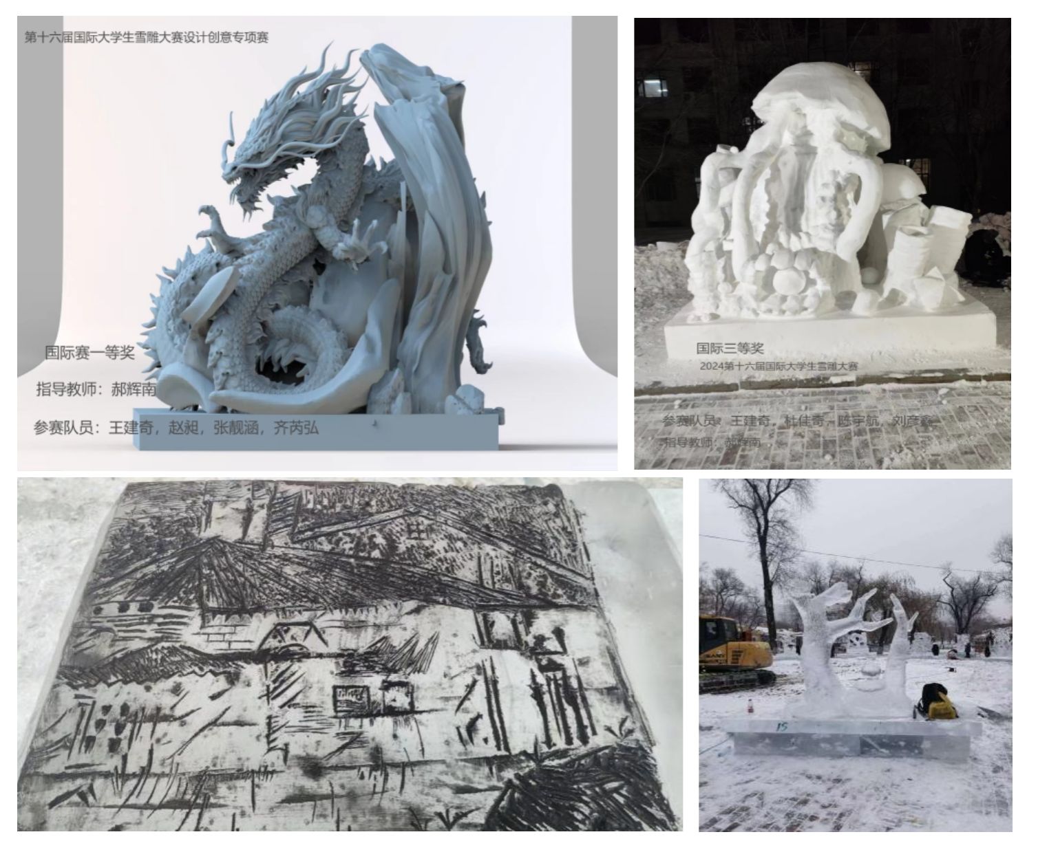2023年12月至2024年1月期间,我校yl6809永利集团选派的冰雪雕队伍参加了第十六届国际大学生雪雕大赛设计创意专项赛、第十六届国际大学生雪雕大赛、黑龙江省大学生冰版画比赛、第五届“龙江雪韵”黑龙江省高校冰雪雕创意设计大赛、第二十一届黑龙江大学生冰雕艺术设计创作大赛、2023冰雪艺术季“冰雪丝路”全国雪雕大赛、2023北国雪韵黑龙江省大学生雪雕邀请赛、黑龙江省大学生冰雕艺术设计大赛20周年纪念活动、第十八届全国大学生冰雕艺术设计创作大赛等9个赛事,获得一等奖1项,二等奖2项,三等奖7项,优秀奖4项、最佳创意奖1项,最佳工艺奖2项,优秀指导教师6项,优秀组织奖2项,特殊贡献奖1项。
