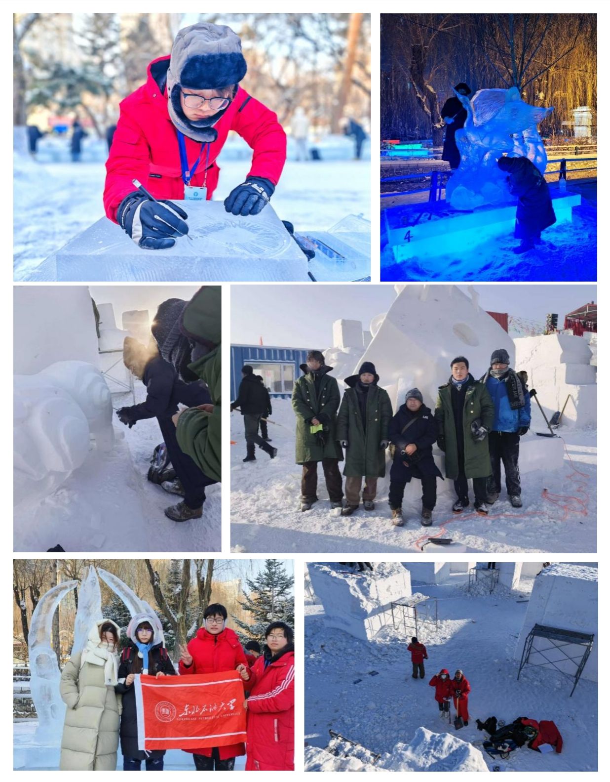 比赛中,我校师生不畏严寒、克服困难,反复对作品进行雕琢,最终创造出立意深刻、构思巧妙、形式新颖的冰雪雕作品,将冰雪雕设计理论和技巧充分运用到实践中,展现了我校参赛师生的设计创作能力和雕刻塑造水平,也展现出东油师生不怕困难、能打硬仗的精神风貌。