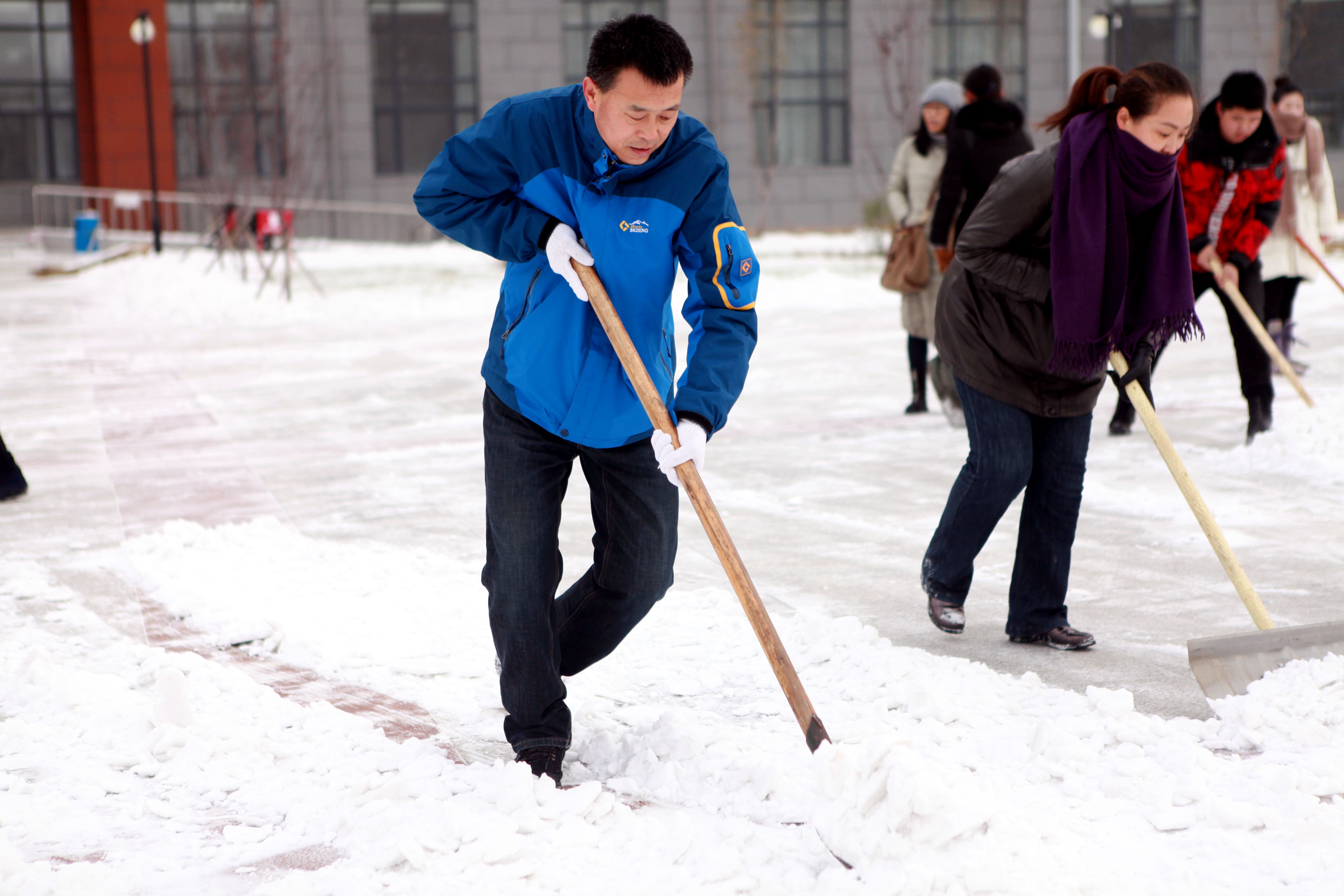 为确保全院师生的出行安全,学院第一时间组织领导干部、党员、教职工与学生进行清雪活动,分批对yl6809永利集团男女生寝室楼下以及教学楼前明德广场进行了清扫。冷冽的寒风和零下十几度的低温使扫雪工作异常艰难。“清雪突击队”的成员们手挥铁锹和扫帚,奋力铲雪、扫雪,用除雪板齐力推雪,老师和同学们的脸冻得通红,手指也冻的不灵活,但这一切并没有影响大家为校园服务的热情。