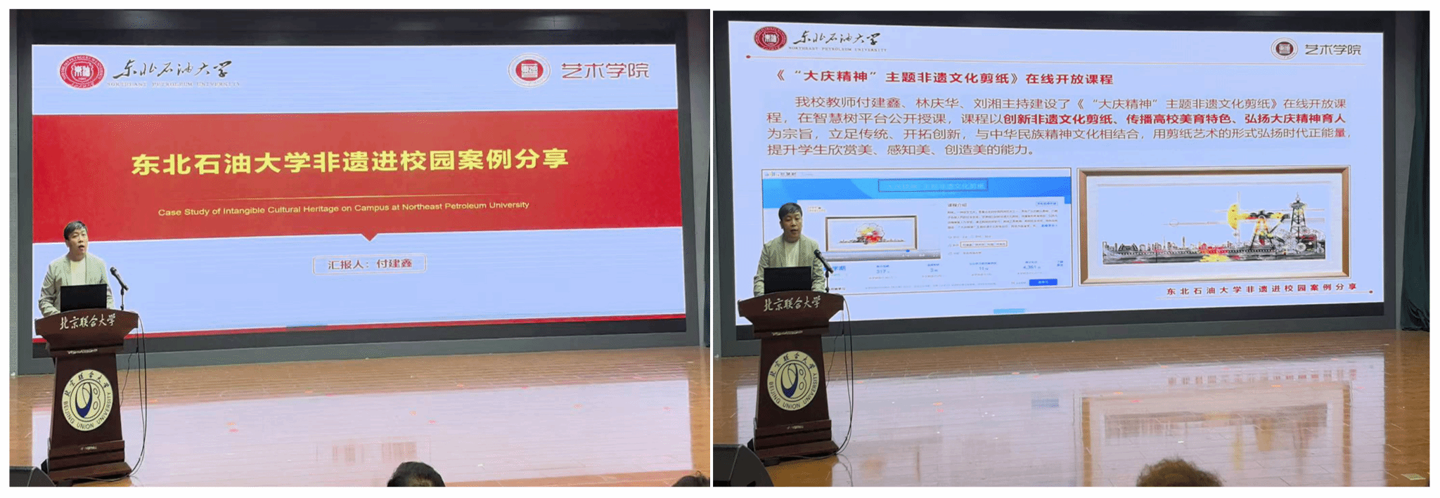 教师付建鑫受邀进行了“永利官方网站非遗进校园案例分享”主题讲座,从两个省级非遗基地成功申请、非遗课程模式、非遗工作室建设、研究成果、实践成果等方面,分享了我校在非遗教学和研究方面的特色做法,并重点介绍了《“大庆精神”主题非遗文化剪纸》项目所取得的一些列成果。会后,多所高校主动对接,希望开展校际非遗教育合作。