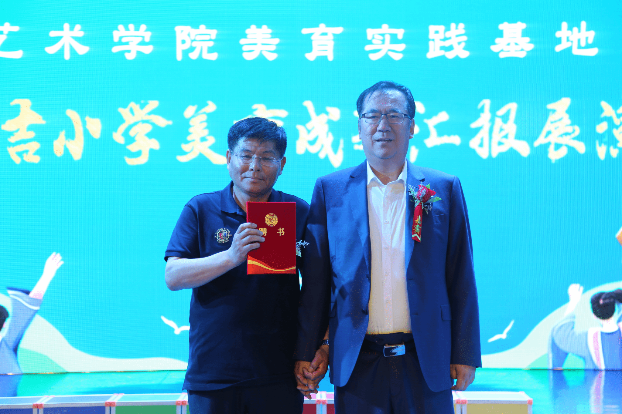 yl6809永利集团党委书记张金辉为民吉小学教师常国英颁发聘书,聘任其为yl6809永利集团民吉学校美育基地主任。院长林庆华、副书记张丽坤、副院长董万多为民吉小学的同学们赠送了礼物。