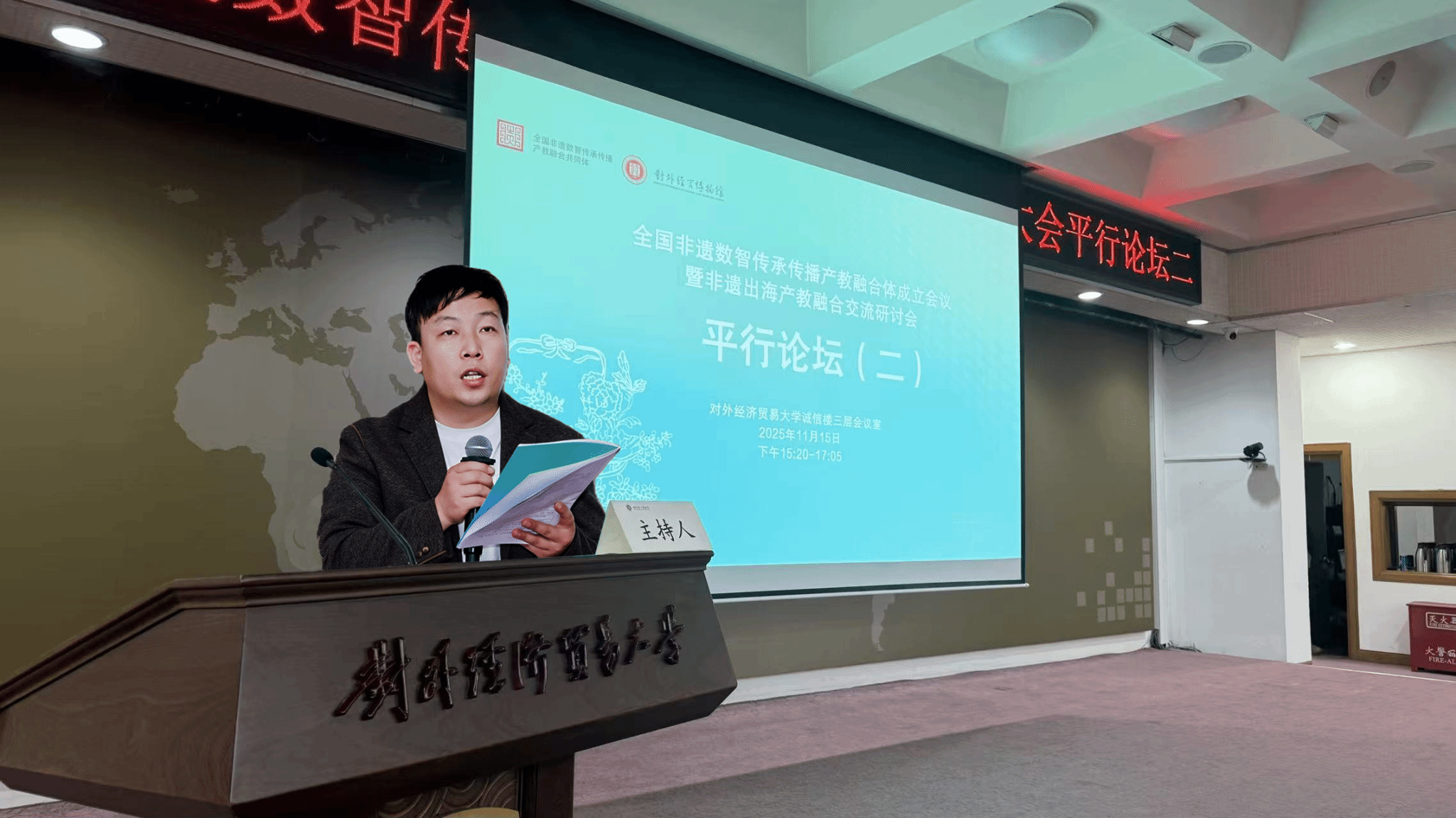 此外,付建鑫老师还应主办方特别邀请,担任会议“平行论坛(二)”的主持工作,聚焦“文化产业专业群建设与非遗产业学院发展”等前沿议题。主持过程中,付老师以其扎实的专业学识与娴熟的现场把控能力,精准引导研讨方向,激发与会学者展开深度对话与思想碰撞,为论坛的高质量交流提供了有力支撑,其出色的主持表现赢得了主办方与在场专家学者的高度赞誉。
