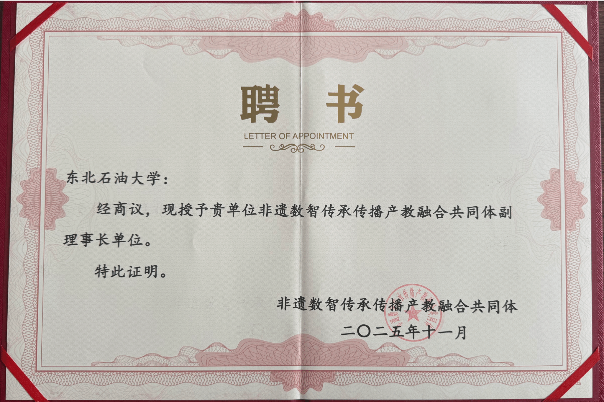 站在新的起点上,yl6809永利集团将以此次获任全国非遗数智传承传播产教融合共同体副理事长单位为契机,持续深化“新文科”建设内涵,推动非遗传承与高等教育融合发展。我们将进一步拓展“非遗+思政”育人路径,探索具有石油院校特色的非遗教育模式,打造集教学、研究、创新、传播于一体的高水平非遗教育平台。未来,学院将积极加强与国内外相关机构合作,推动非遗数字化、国际化进程,为中华优秀传统文化的传承创新贡献更多智慧与力量,在新时代文化建设的征程中展现高校的使命与担当。