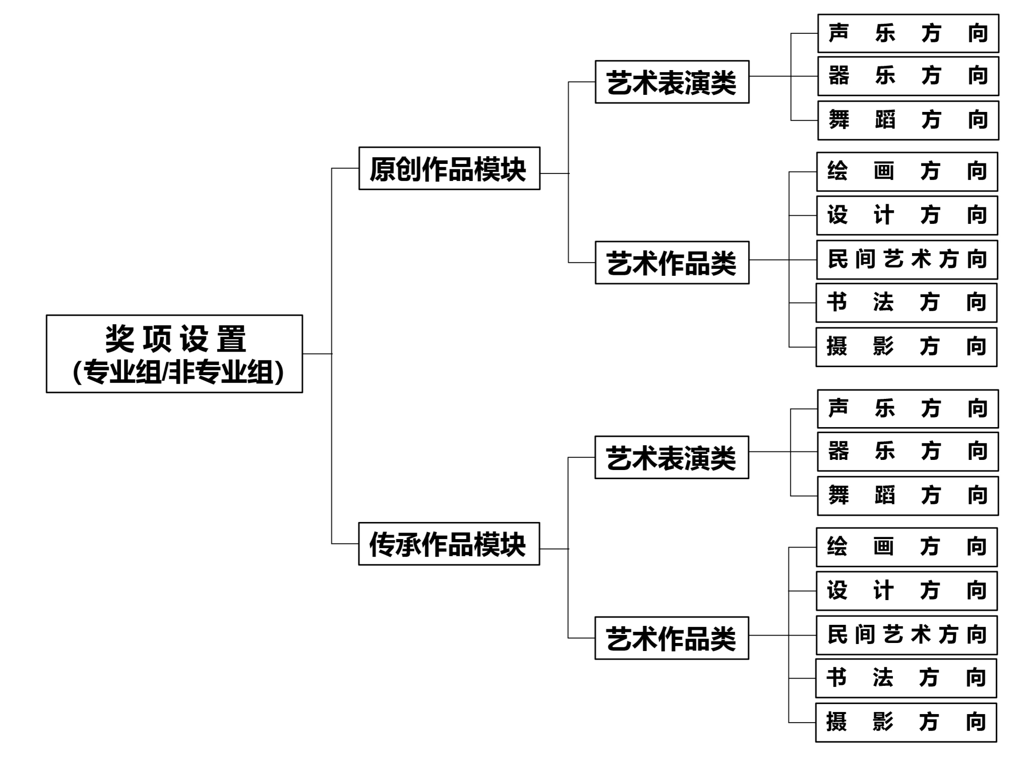 项目分为专业组、非专业两个组别,yl6809永利集团学生为专业组;每组分为原创作品模块和传承作品模块,每模块下设艺术表演类和艺术作品类,各类分为以下具体专业方向: